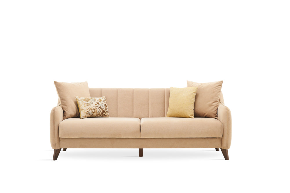 Combining the functional and high comfort design set-up of contemporary decoration with remarkable touches, FABIA LIVING ROOM brings maximum comfort to living spaces. It completes special sewing applications used in body and armrests with rich fabric and throw pillow alternatives. The easy-to-open bed mechanism within the 3 seat sofa stands out as a functional detail that makes everyday life easier. Walnut-coloured special leg application adds a natural and elegant interpretation to the design.