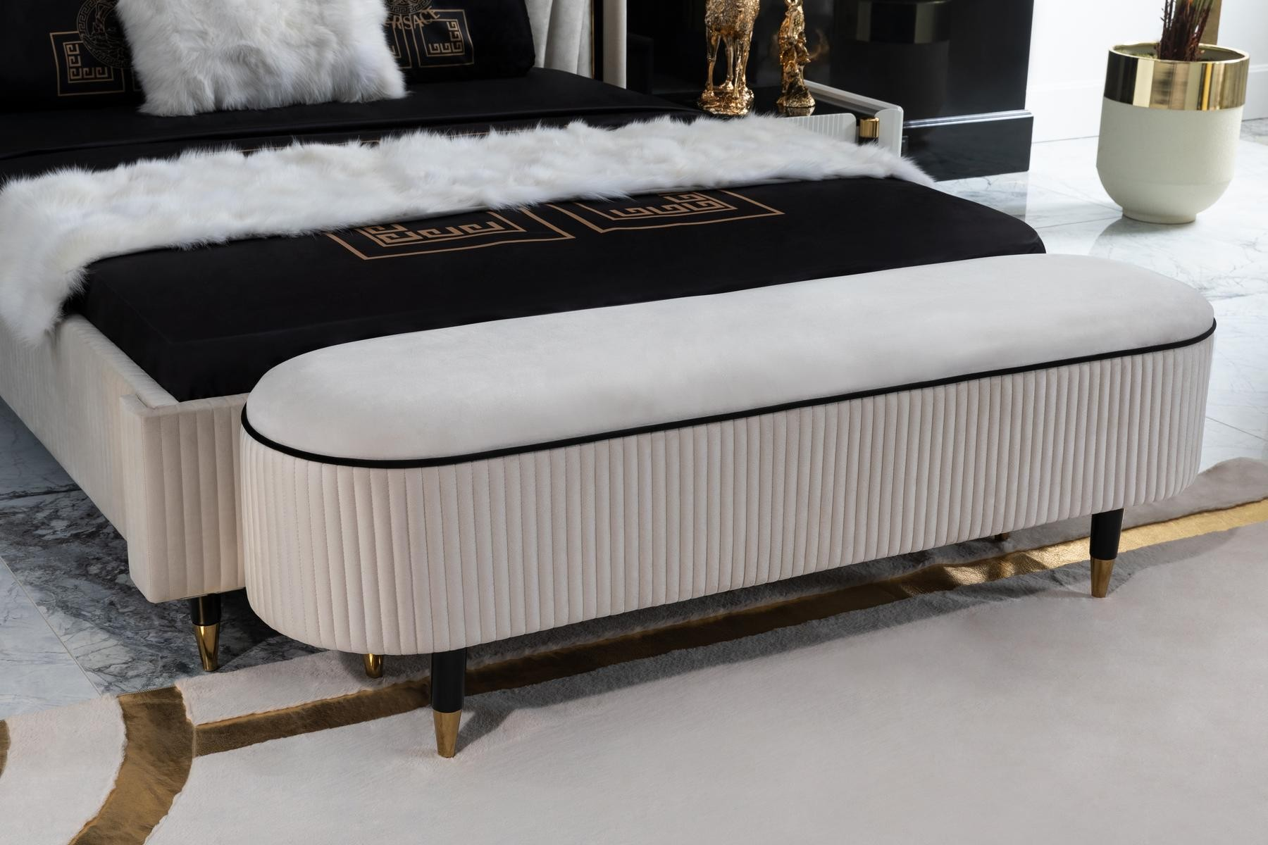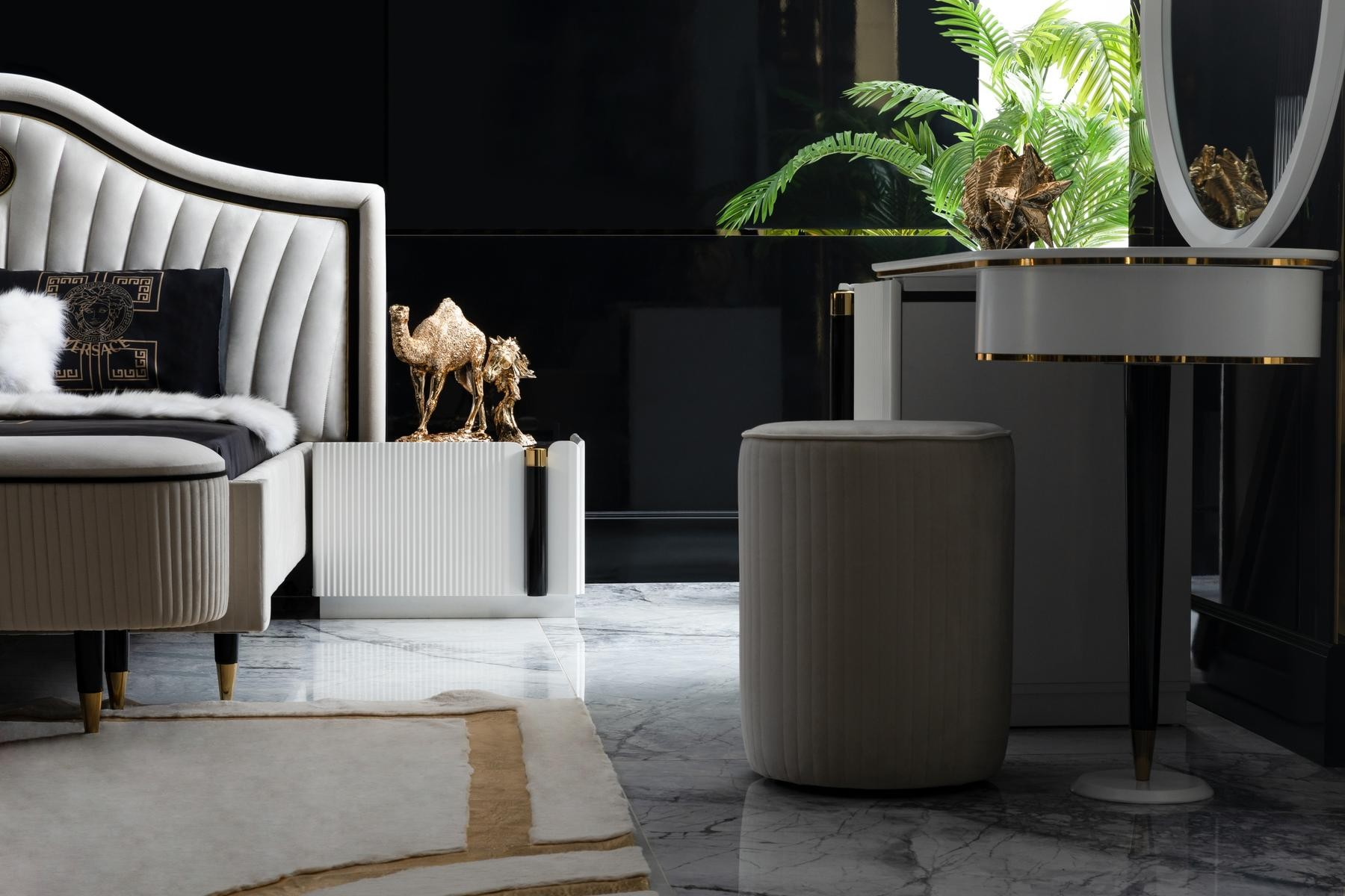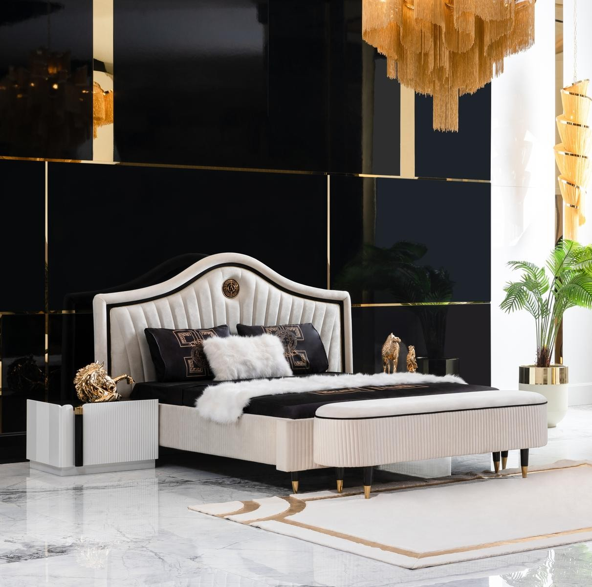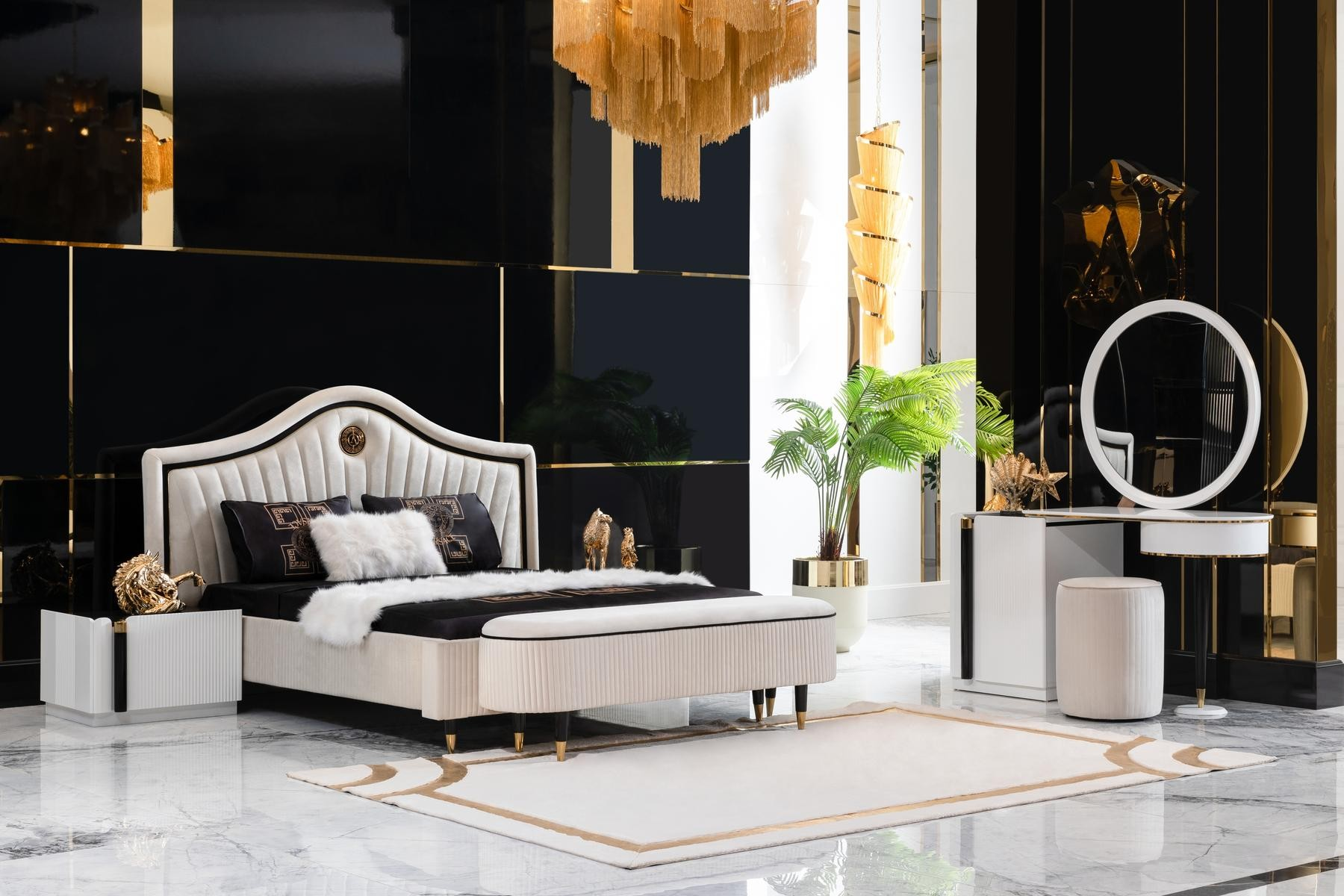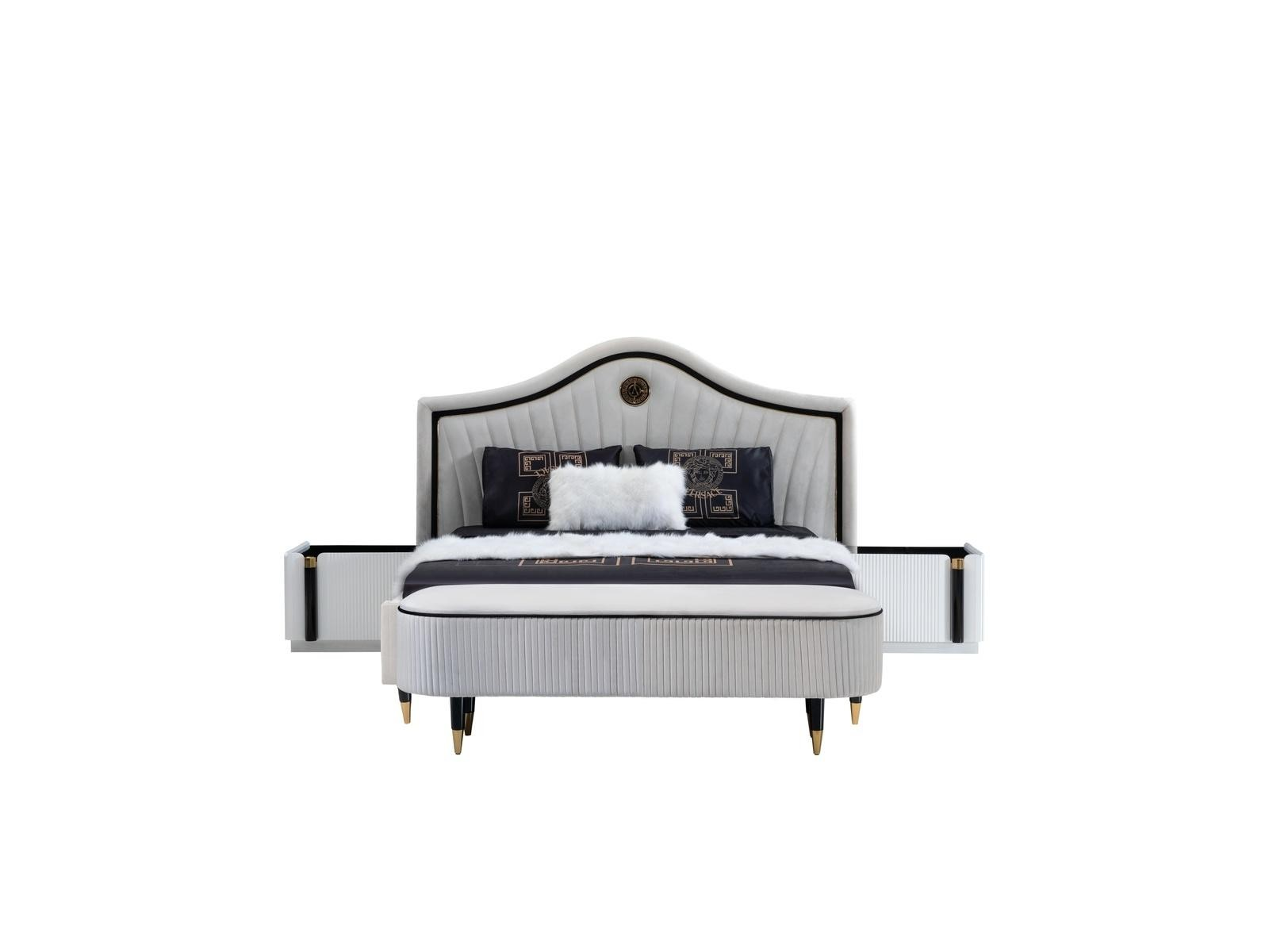 Featuring a stylishly upholstered bed, coordinated nightstands, and functional pieces like a bench and pouffe, each element is crafted from high-quality materials to ensure durability and lasting appeal. The set’s refined aesthetic fits effortlessly into both minimalist and contemporary interiors.